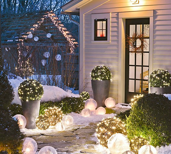 Create an enchanting entrance for the season by lining a walkway with grapevine balls and boxwood spheres with lights. Decorate with orbs in varying sizes to enhance the path’s whimsical appeal.