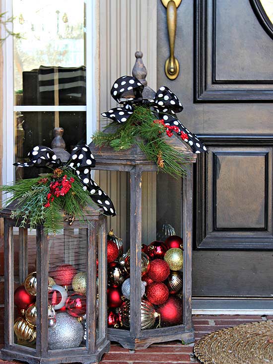 Glitzy red, gold, and silver ornaments spruce up two large lanterns, an easy and inexpensive way to add flair to a front porch. Top the lanterns with greenery and polka-dot bows for added holiday spirit.