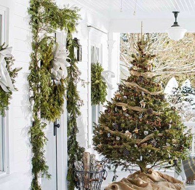 A decorated evergreen tree, wreaths, and garland are captivating against an all-white backdrop. Decorating with a wire basket filled with firewood reinforces the natural coziness that oozes from this front porch.