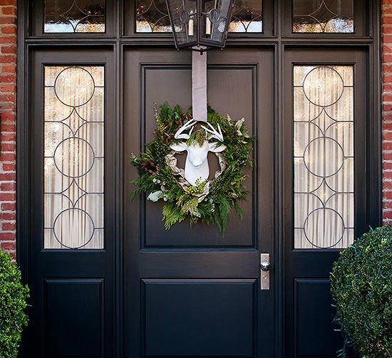 A papier-mache deer trophy spray-painted white makes an eye-catching statement against a black door, while a natural wreath made of live greens softens this posh front entry.