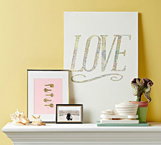 thestoriesofa2z.com decorated her Valentine’s Day mantel with her love of tea in mind. She created the heart tags and the heart on the white plate using a die-cutting tool; she painted the tags by hand to give them texture. She cut the Shakespearean quote (“Love comforteth like the sunshine after the rain”) using her die-cutting tool and glued the letters to black cardstock. She taped the finished piece to a mirror with a wrought-iron frame. The flowering branches were made by attaching faux greenery to sticks using crafting wire and adding pink tissue-paper blossoms.