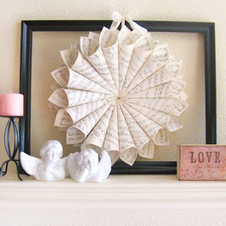 A crafty wreath made from sheet music hung in a black frame accents this simple Valentine’s Day mantel. To make the wreath, adiamondinthestuff.blogspot.com split a foam wreath form in half, covered it in cream-color satin ribbon, and hot-glued two layers of sheet music cones to it in a circle. She wanted to keep her mantel decorations simple, so she pulled most of these items from around her house. White ceramic angels, a wrought-iron candleholder, and a small box with a quote (“Love: Two Hearts, One Love”) finish the display in style.