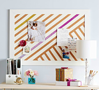 A standard bulletin board gets a Valentine’s Day makeover with decoupage and glitter. Use painters tape and a ruler to mark straight lines, then paint the exposed areas with white latex paint. Remove tape when dry. Then tape around the center strip. Paint it with decoupage medium, and coat with a thin layer of glitter. Let dry. Use tacks to pin up Valentine’s Day cards, quotes, heart decorations, photos, and other remembrances.