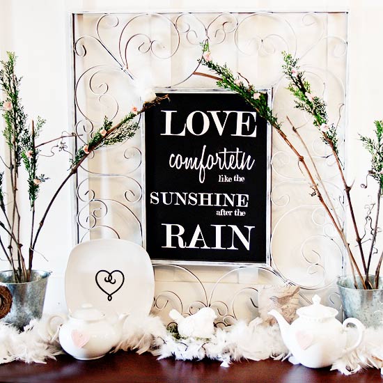 thestoriesofa2z.com decorated her Valentine’s Day mantel with her love of tea in mind. She created the heart tags and the heart on the white plate using a die-cutting tool; she painted the tags by hand to give them texture. She cut the Shakespearean quote (“Love comforteth like the sunshine after the rain”) using her die-cutting tool and glued the letters to black cardstock. She taped the finished piece to a mirror with a wrought-iron frame. The flowering branches were made by attaching faux greenery to sticks using crafting wire and adding pink tissue-paper blossoms.