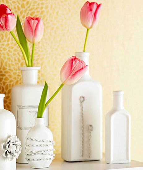 Instead of casting off old bracelets, earrings, and necklaces, give them new life as a Valentine’s Day accent for inexpensive vases. Use jewelry or glass glue to secure chains to glass bottles, either in a neutral color or in pink or red. Try wrapping chains around bottles, outlining shapes, positioning as letters or numbers, or creating other simple designs. We removed the pin from the back of a plastic flower to embellish one of the bottles. When the glue is dry, prime the bottles and paint with high-gloss paint. We chose white, but this collection would look equally stunning in glossy cobalt or yellow.