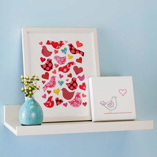Personalize these cute Valentine’s Day crafts for shelves and nooks. To craft the collage, cut out repeating shapes from fabric (we used birds and hearts in various sizes) and use spray adhesive to mount on white cardstock; frame. For more advanced crafters, design a work of Valentine’s Day art. Pencil a design on a store-bought canvas, then sew over your drawing using a thick needle (we used a backstitch).