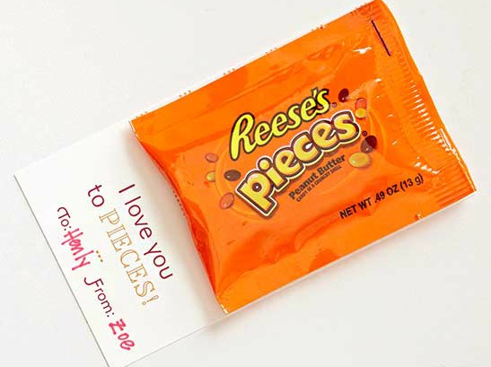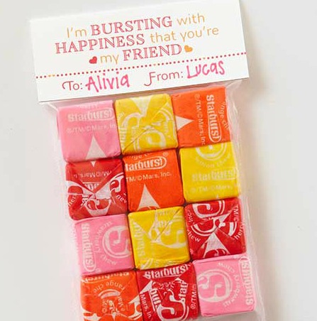 For an inexpensive alternative to ready-made Valentine’s Day candy, attach the personalized label using a stapler. Look for cute ways to work the candy’s name into the message, as shown.