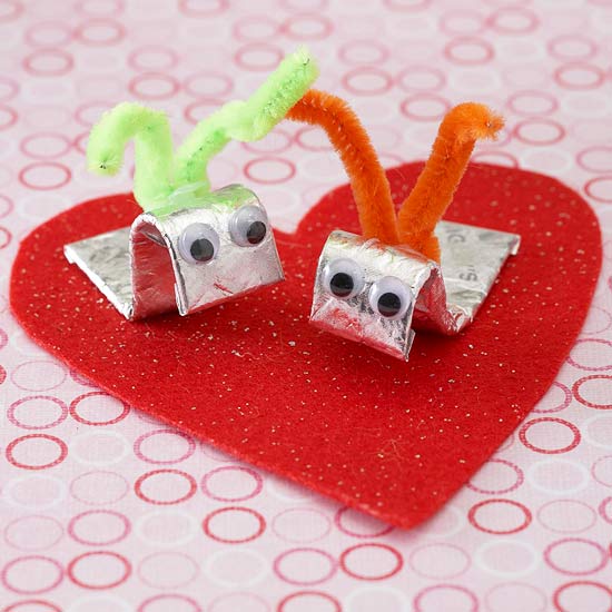 These cute little “love bugs” are impossible to resist — add a pair of googly eyes and pipe cleaner antennae to a stick of gum and adhere the creatures to a heart shape to make a fun Valentine’s Day gift.