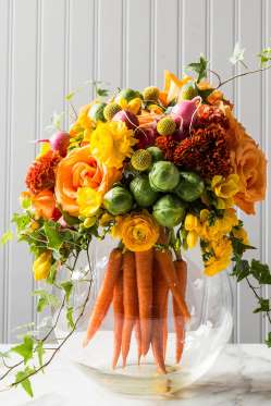 This colorful arrangement is the spring equivalent of a springtime cornucopia, relying on both flowers and produce for its beauty. Instructions here.