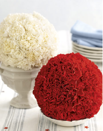 Carnation balls are a fresh take on a humble flower. They add a fun burst of color to your Fourth of July table, and they’re easy to make.Step 1: Thoroughly saturate a 3-inch sphere of floral foam with cool water.Step 2: insert short carnation stems — cut to an inch below the calyx — in a concentric, coiling pattern until the sphere is almost covered. Each of these spheres holds about 50 carnations.Step 3: Display carnation balls individually, or cluster balls of varying sizes — and color — on a favorite vase or tray to create a distinctive and dramatic centerpiece.Step 4: Place sphere with its “bald spot” in a saucer of cool water; refresh daily and it will last a week.