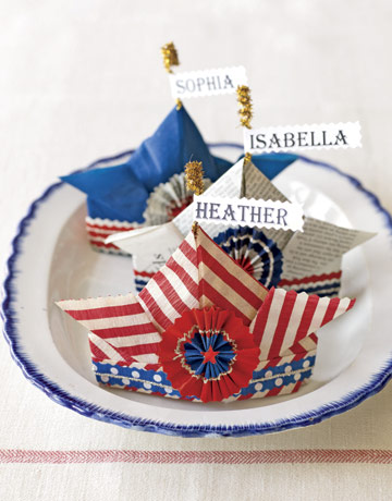 Learn to fold these charming paper-hat place cards, then add colorful bands, rosettes, and toppers. Make a sparkling hat topper by coiling a metallic pipe cleaner around a pencil, then carefully inserting the pipe cleaner into the top of the hat. Print or hand-stamp a name banner and trim with pinking shears. Fold hats using newspaper or red, white, and blue crepe paper. Look for striped and dotted paper, too.