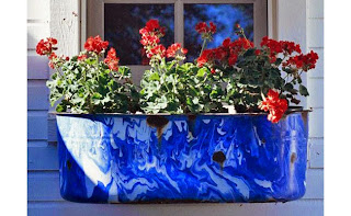 Red, white, and blue plant groupings and gardens are rare, and there’s a reason for that. They can look cluttered and theme-y. Also, there are very few truly blue flowers. Most are a variation of purples and lavenders. You can’t deny this blue planter box with red geraniums is super charming and patriotic.