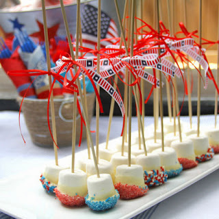 For an easy no-bake goody that doesn’t require utensils, whip up a batch of these patriotic marshmallow pops. Marshmallows are stuck onto long bamboo skewers, dipped into melted white chocolate, and then rolled in red, white, and blue sprinkles. After they’ve had time to cool, decorate the pops with festive ribbon bows and arrange on a tray for serving. Guests can help themselves! These yummy one-bite treats are easy to customize for any holiday or celebration. Simply change the colors of the sprinkles and ribbon, or substitute the white chocolate for colored candy melts, which can be found in most craft and baking stores. Step 1: Thread regular- or jumbo-size marshmallows onto bamboo skewers. Step 2: Melt white chocolate or candy melts according to the manufacturer’s instructions. Step 3: Dip the marshmallows about halfway into the melted chocolate. Allow the excess chocolate to drip away, tapping on the side of the bowl if necessary. Step 4: Before the chocolate dries, roll the marshmallows in sprinkles and place on a piece of wax paper to cool completely. Step 5: Before serving, decorate each marshmallow pop with a bow of festive ribbon. Arrange in rows on a serving tray so that guests can help themselves.