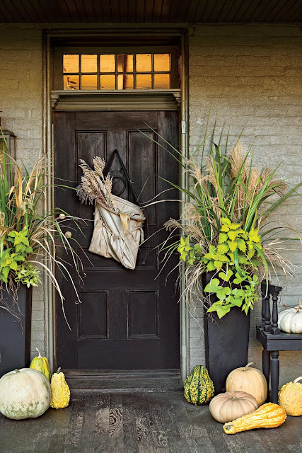 Fall weather makes us crave a cup of tea or a pumpkin spice latte. To make your outdoor fall decorations more functional, include a cozy bench or seating area to sip your beverage of choice on a crisp morning or afternoon. Weatherproof pillows will provide extra comfort and a sturdy blanket will bring warmth. And, of course, the more pumpkins, the merrier!