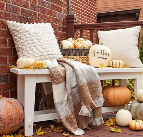 Fall weather makes us crave a cup of tea or a pumpkin spice latte. To make your outdoor fall decorations more functional, include a cozy bench or seating area to sip your beverage of choice on a crisp morning or afternoon. Weatherproof pillows will provide extra comfort and a sturdy blanket will bring warmth. And, of course, the more pumpkins, the merrier!