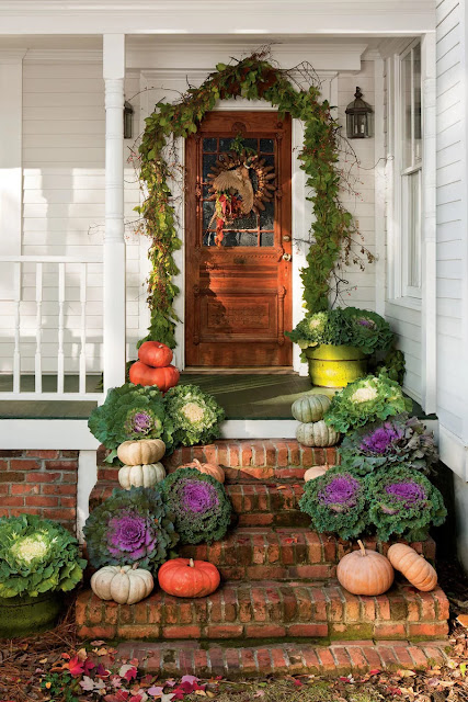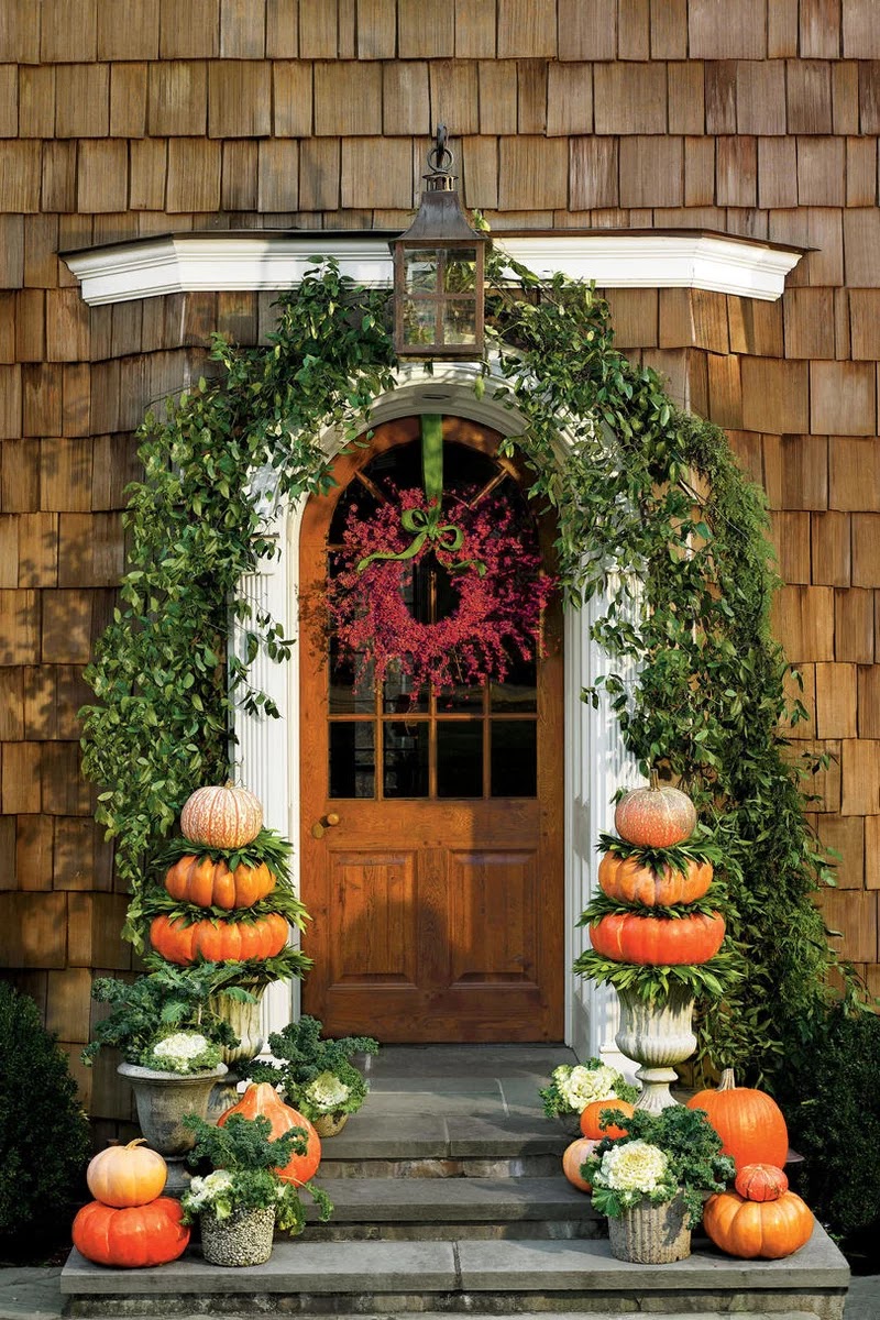 Think beyond ground-level pumpkin clusters and take your fall porch decor vertical. These pumpkin stacks use ‘Rouge Vif d’Etampes,’ ‘Red Eye,’ ‘Long Island Cheese,’ and ‘One Too Many’ pumpkins and also incorporate leafy kale, cabbages, and bay leaves for contrasting color and texture.