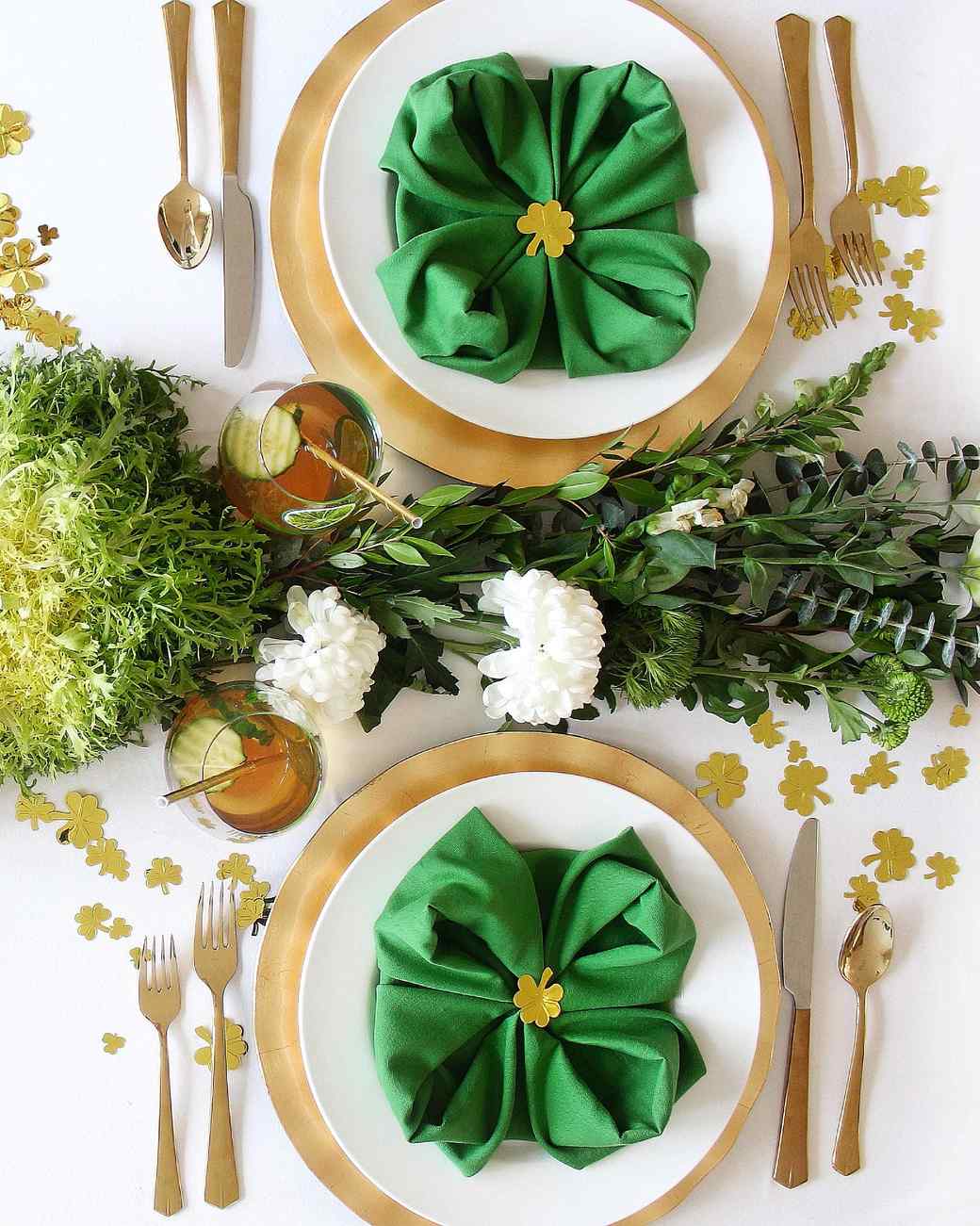 A folded napkin can serve double duty at the table: as clever décor and practical use. If you’re hosting a St. Patrick’s Day feast of hearty corned beef and cabbage, greens, or sweet treats, greet your guests with a clover-inspired napkin. ~ GET THE FOUR-LEAF CLOVER NAPKIN FOLD