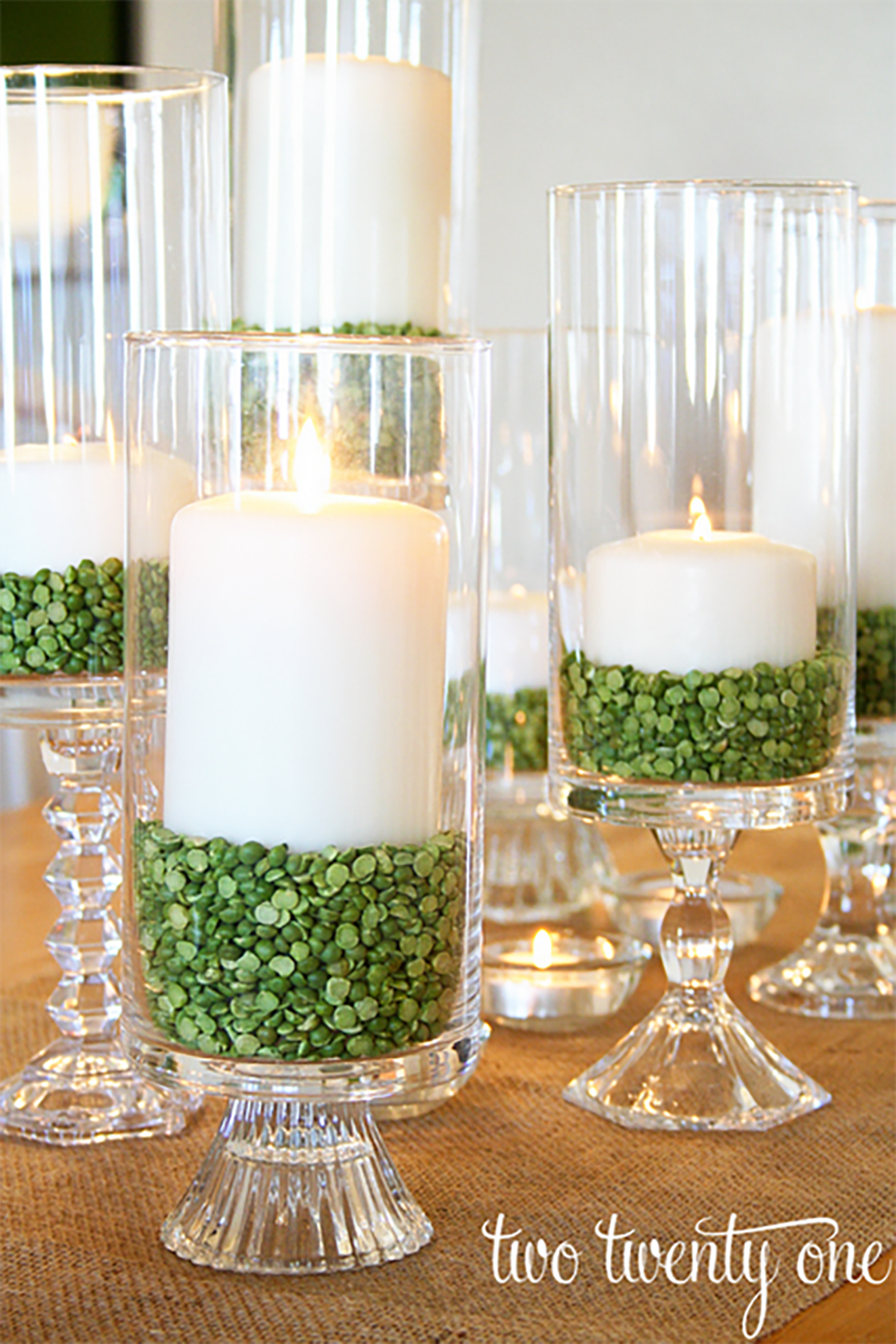 Yes you can play with your food, play around with dried split peas to give centerpieces a pop of vibrant color. ~ Get the tutorial at Two Twenty One.
