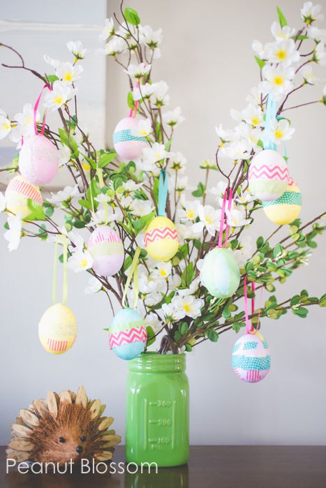 Hang your decorated Easter eggs on a sprigs of silk flowers for a festive “tree.” Get the tutorial at Peanut Blossom.