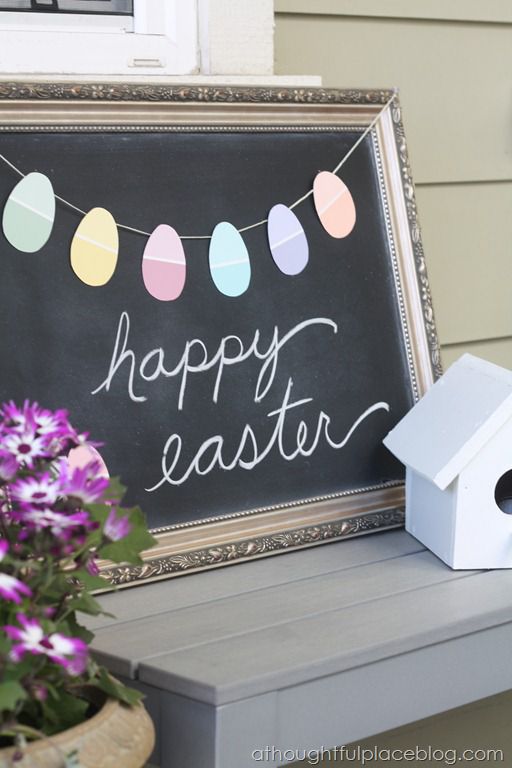 Repurpose leftover paint chips as colorful Easter eggs. When strung across a chalkboard sign saying “Happy Easter” and placed on the porch, this easy homemade decoration provides a warm welcome. Get the tutorial at A Thoughtful Place Blog.