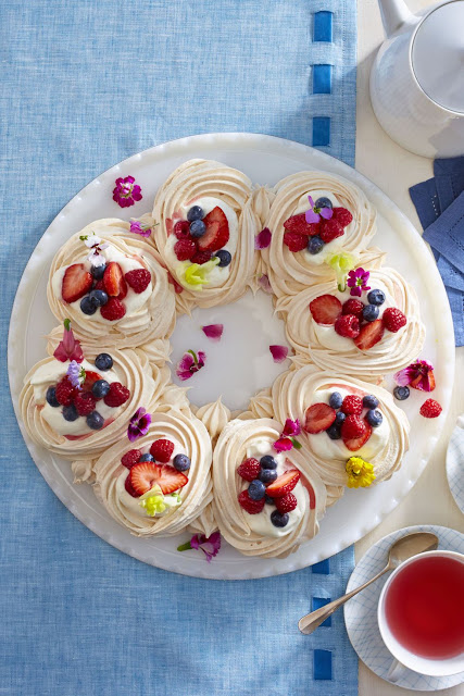Meringue Wreath This fruit-studded meringue wreath, filled with fresh cream and topped with floral petals, is the perfect light dessert.Get the recipe.