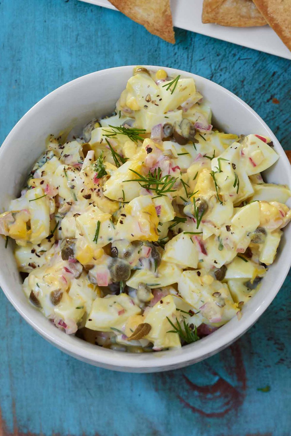 Egg Salad with Capers, Red Onion, Lemon, and Dill This classic egg salad recipe incorporates some interesting ingredients like capers and red onion — slather it on a toasted bagel for breakfast!Get the recipe.