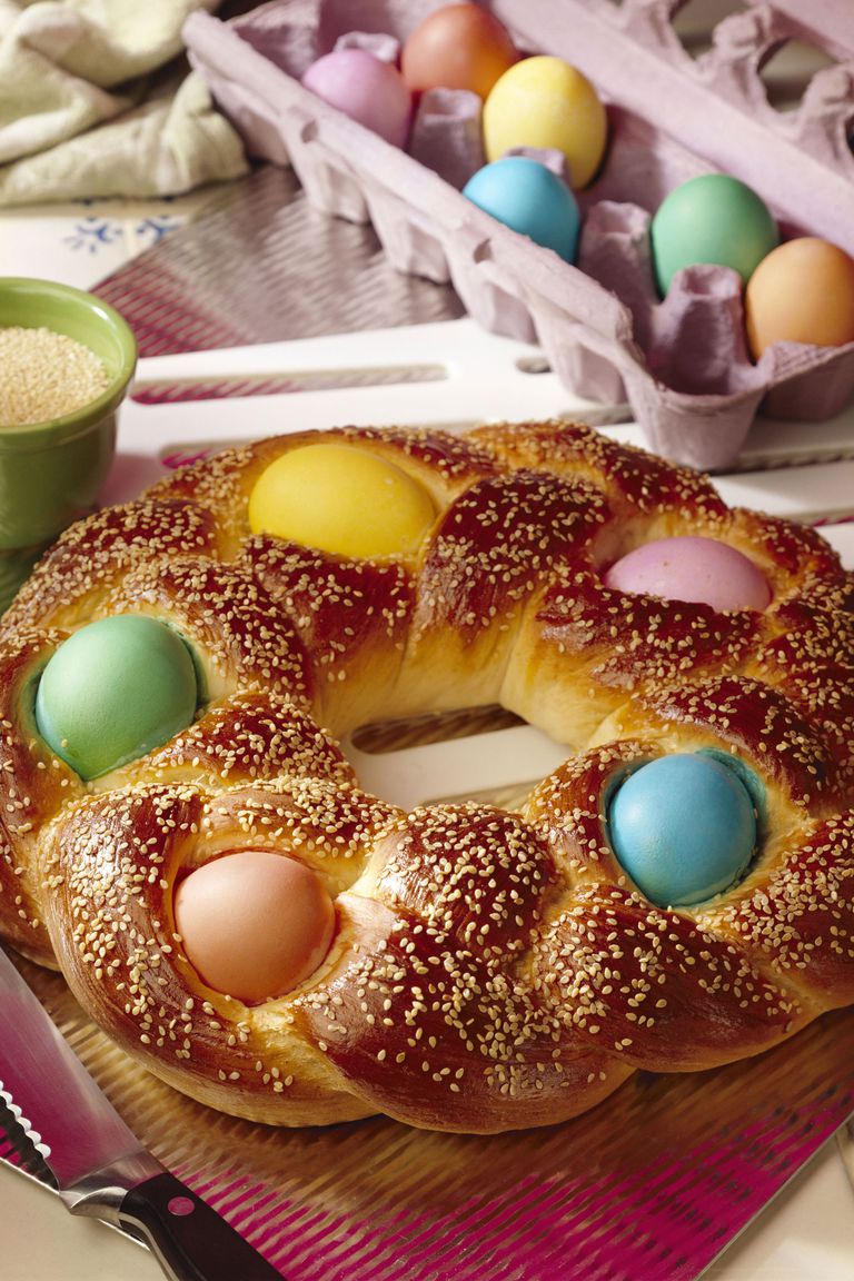 Tsoureki Custom dictates that eggs, dyed a scarlet red, be baked in the braided crown of this Greek Easter bread.Get the recipe