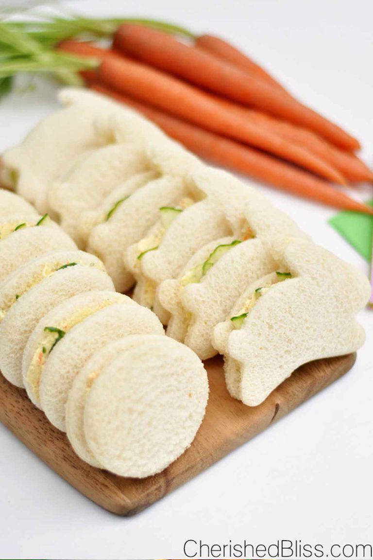 Easter Cucumber Sandwiches Hosting tea? Use cookie cutters to turn simple sandwiches into Easter masterpieces. Get the recipe at Cherished Bliss