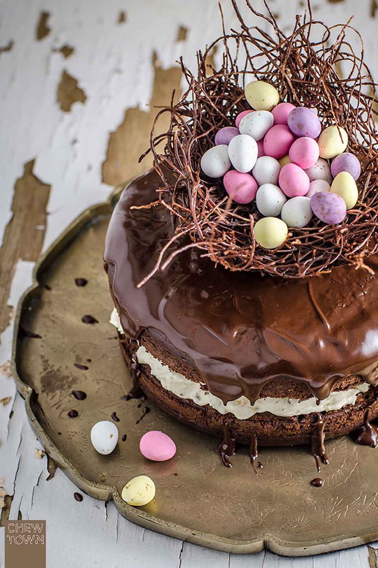 Chocolate Easter Egg Nest Cake Your guests won’t be able to look away from this beauty, which might be the prettiest Easter chocolate cake that we have ever seen. Get the recipe at Chew Town.