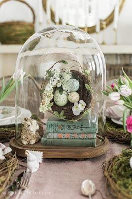 Add a homey, vintage feel to your Easter table by stacking classic books within a delicate glass cloche. Stick with green spines to stay true to the seasonal color palette, then pair with tulips and bunny decor. Get the tutorial at So Much Better With Age.