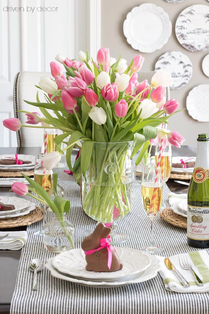 Massive bunches of tulips brighten up this simple Easter tablescape, and chocolate bunny place “cards” mark each spot. Get the tutorial at Driven By Decor.
