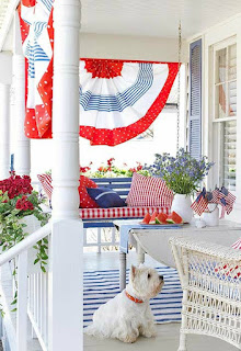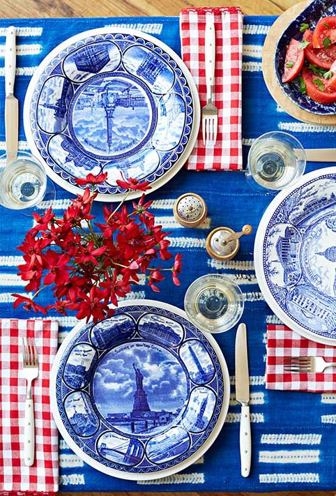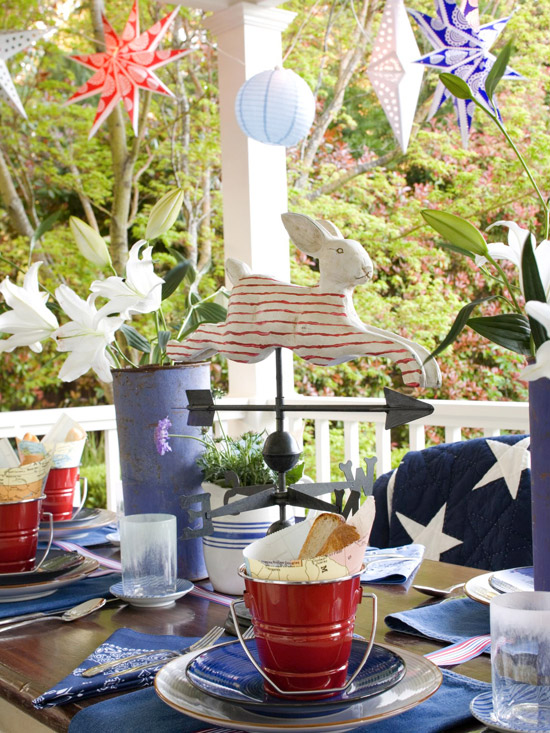 Table decorations in red, white, and blue make a fabulous seasonal celebration. Ground each place setting with blue denim place mats, strips of striped ribbon, and bandana napkins. Top stacked blue and white plates with enameled red buckets lined with map-printed paper, and fill with soft rolls or baguettes. A jaunty red-and-white rabbit weathervane makes a charming folk art centerpiece when flanked with white lilies in blue sap buckets. String pierced paper lanterns on a multisocket lantern cord, and suspend from the porch ceiling with cup hooks.