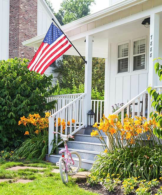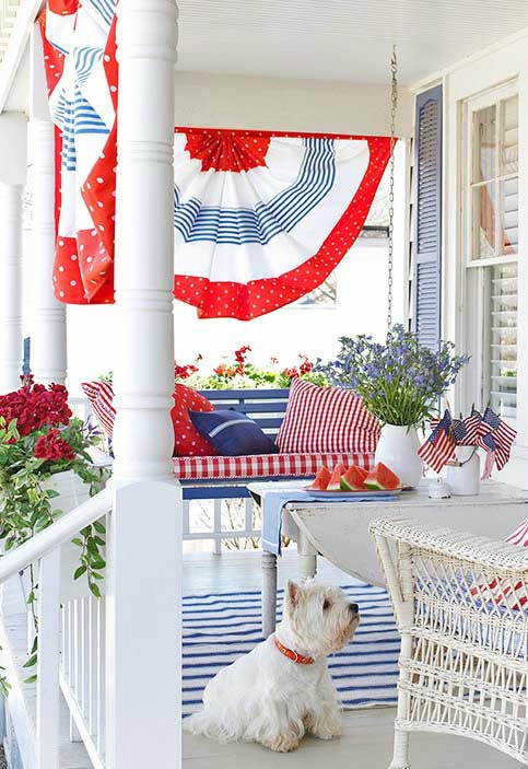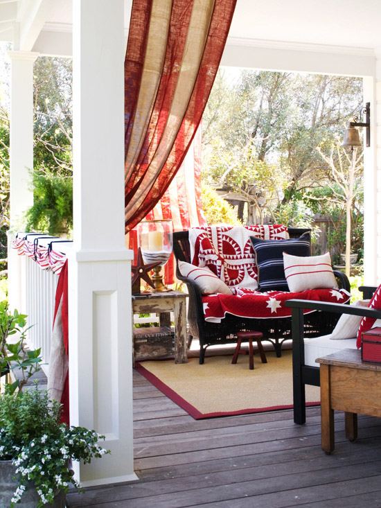 Layered in red, white, and blue, any outdoor space becomes patriotic. Set the scene by hanging a flag (hang the blue field at the top left as it is viewed from the street or yard). Striped fabric, gathered and tied to the porch railing with heavy blue yarn, recalls classic bunting.