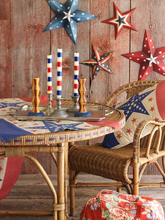 Decorate your porch or patio like a permanent fireworks display. Attach painted metal stars to the house front or fence, and drape a table in a star-spangled tablecloth. Toss star-printed pillows on the chairs, and accent the table with red-, white-, and blue-stripe candles that look like Roman candles ready to explode into a sparkling display.