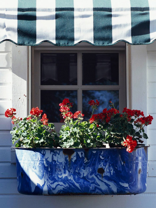 Because true blue is so difficult to find in nature, search for containers that fill the role. This enameled metal tub in blue and white is a perfect foil for red annuals such as geraniums or petunias. Be sure to drill holes in the bottom of the tub to allow drainage and prevent the window box from becoming too heavy.