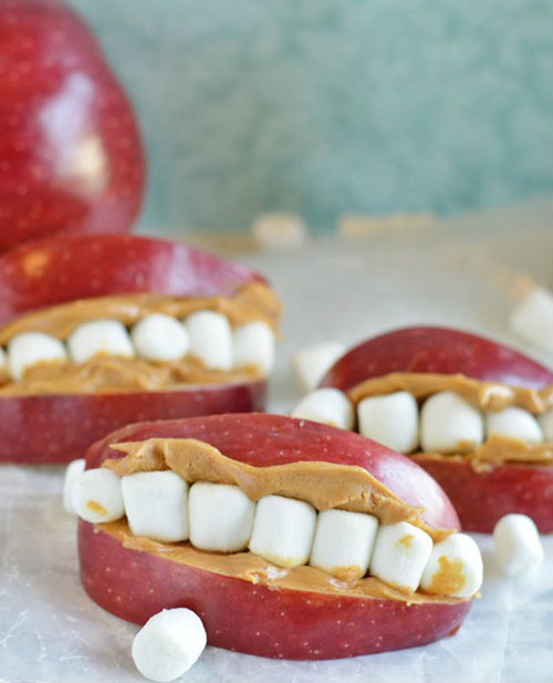 This peanut butter-stuffed apple is a treat you’ll be dying to bite into. What we love about this recipe is that it not only serves as the perfect Halloween nibble, but it doubles as a learning lesson about healthy brushing habits for your children. While eating apples and peanut butter is a pretty common combo, the crown jewel of this recipe comes from the marshmallow teeth. Adding a bit of sweetness and a more complex texture, you’ll never want to eat apples without them again! Plus, this cheeky snack will give you and your kids a chance to brush up on tooth regime talk—because monsters have pearly whites, too!