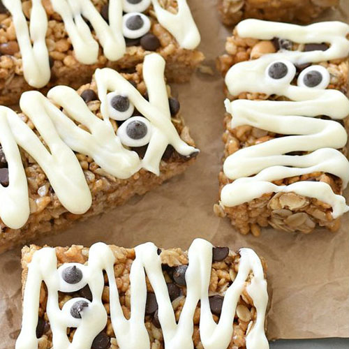 Using granola bars or even rice crispy treats, you can make these little mummies that are almost too cute to eat … ALMOST! Just drizzle with white chocolate (dairy-free or normal) and add in edible googly eyes to mummify your masterpiece. Make a big batch for a cute and healthy Halloween treat for your kids’ class!