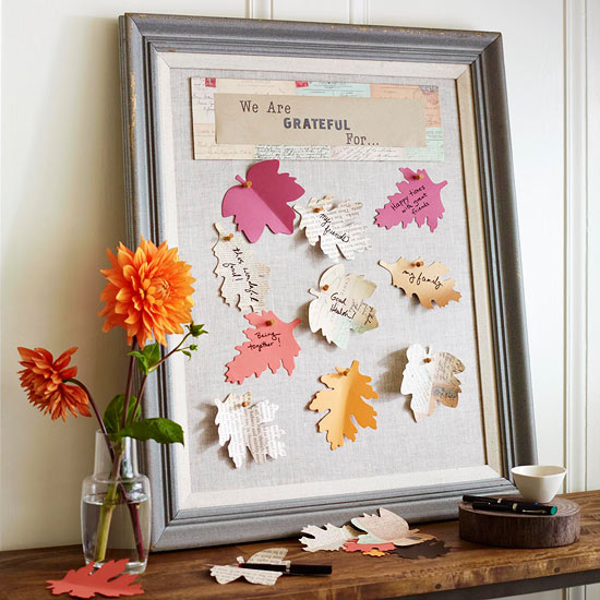 This pretty Thanksgiving craft might be our favorite way for loved ones to show their thankfulness during the holidays. Cut out leaf shapes from colored paper or old book pages — choose colors that match your existing decor to create a piece that fits right in! Then have family members write thankful messages on each leaf and attach them with push pins to a linen-covered cork board.
