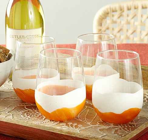 A toast to the season! Starting with stemless wineglasses, gather white, orange, and black enamel paint (the black is to tint the orange). Pour the white paint and the tinted-with-black orange paint into individual bowls. Dip the glasses first in white, allowing excess paint to drip off; let dry. Dip in the orange paint; let dry. Though these glasses are not dishwasher safe, they are easy to clean with light soap and water.