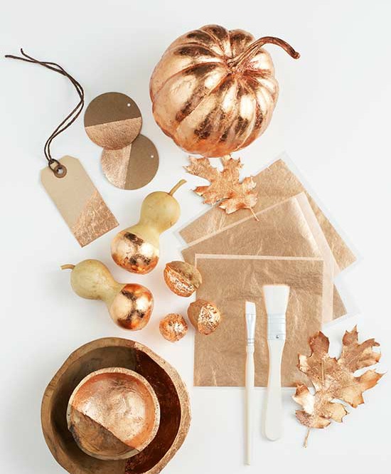 Homemade Thanksgiving decorations don’t get much trendier than this. Look to copper leaf and adhesive to glitz up to your Thanksgiving table decor. Make golden gourds, acorns, serveware, and more! Use painters tape for perfect lines.