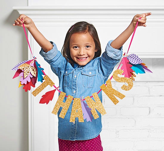 Dress any mantel or doorway with this quick and easy Thanksgiving craft. Plus, it’s a great project for the kids to help with! Just cut leaves from colored paper, then glue to ribbon or string along with store-bought glitter letters.