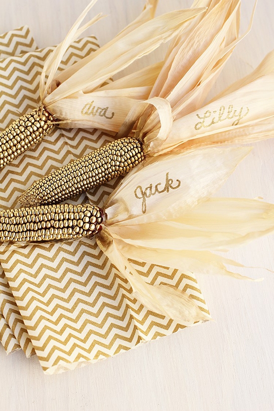 Get your Thanksgiving tabletop craft inspiration from the fall harvest season with these corn husk placeholders from Freutcake. Ears of corn spray-painted gold go from produce to Pinterest-worthy Thanksgiving table decor in minutes. Use a gold paint pen to scribble each name onto the husk for a country-glam vibe your guests will love.