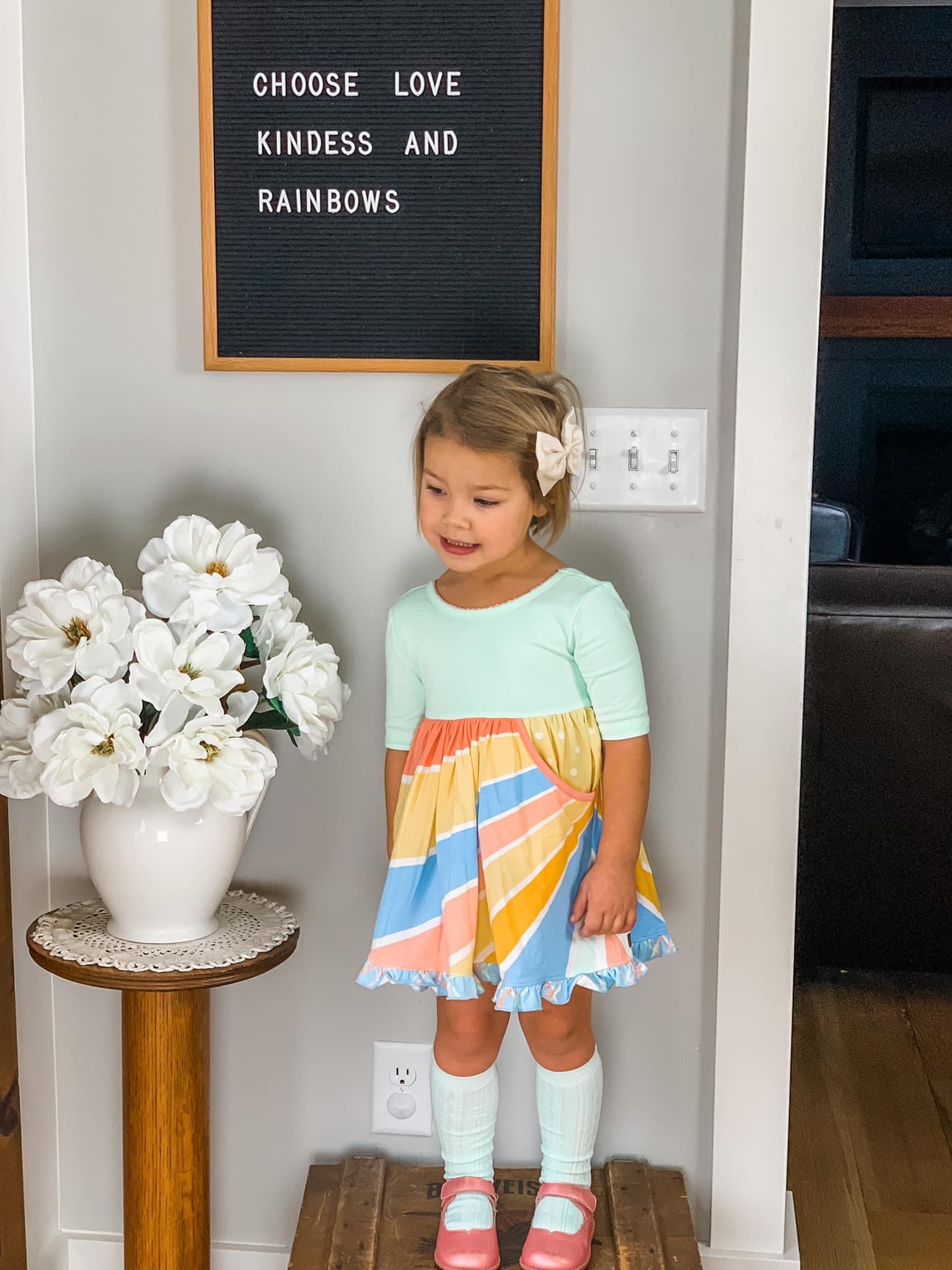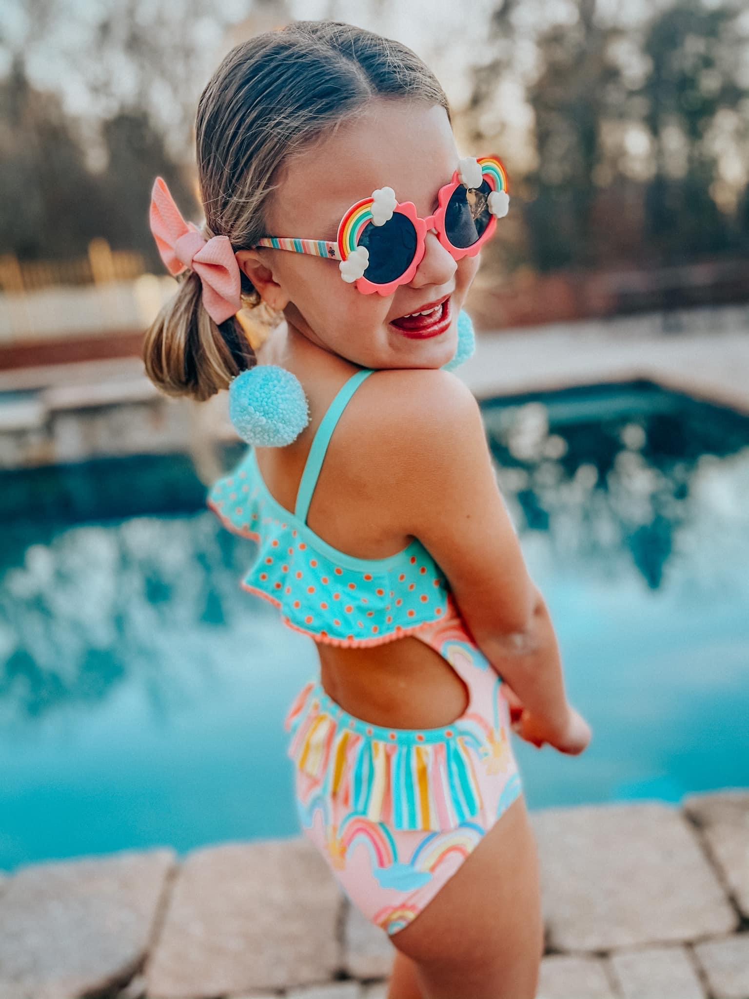 Our tropical print will make you want to escape to a beach now and rainbows to light up every girls mood! Click here to shop