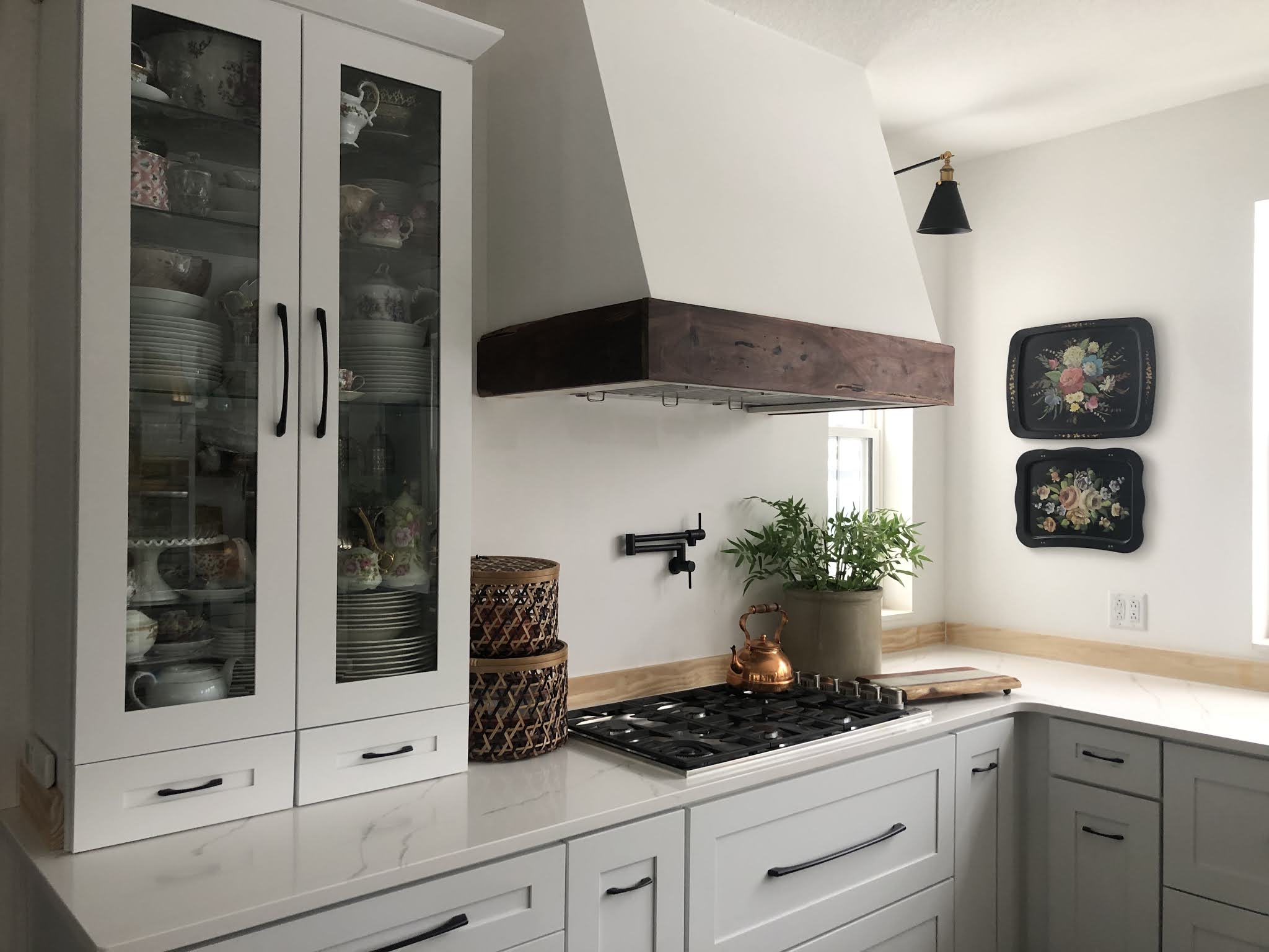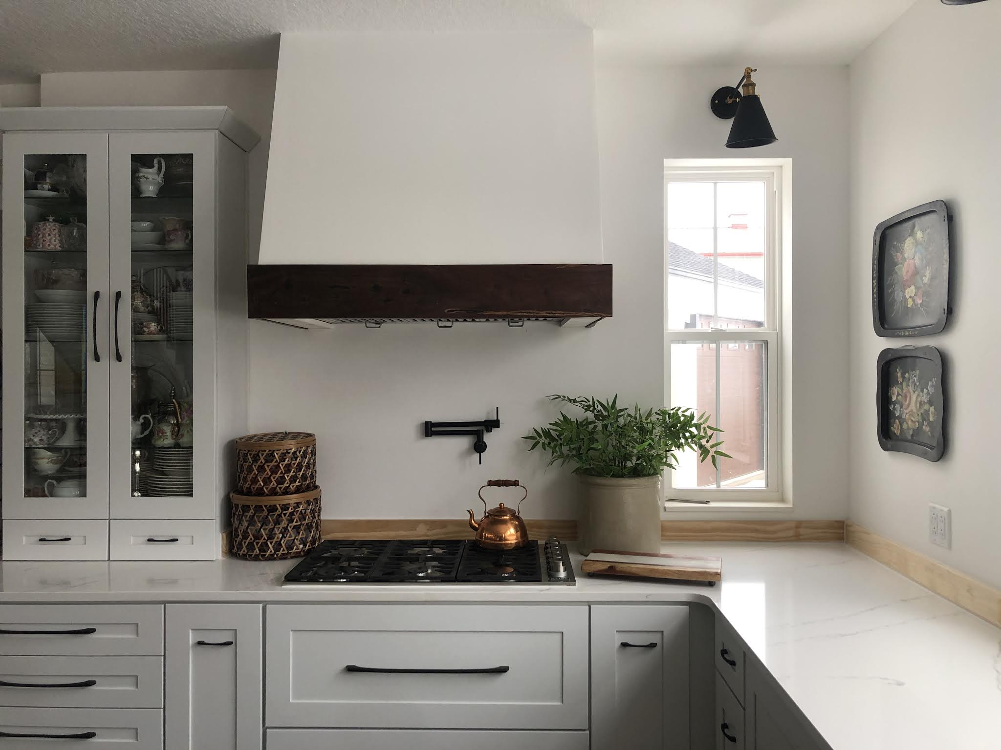 After months and months of looking for hood designs we kinda settled on simple. We knew we wanted to incorporate real, unfinished wood somehow without doing wood on the whole thing. I am not a big fan of shiplap, I know I know shoot me now, but I do LOVE old, original shiplap found in older homes + buildings that hasn’t been painted. Don’t get me wrong new shiplap looks fabulous in other peoples spaces but it’s just not for me … we are more traditional modern house style people, not farmhouse style.