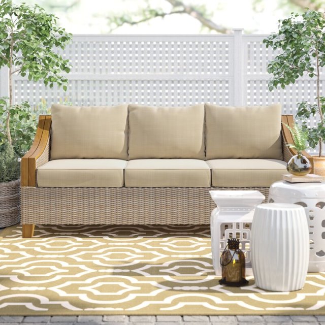 Kindcaid Sofa ~ Style, meet the ultimate in durability. This teak-and-wicker-framed three-seater sofa is crafted with some of the hardiest materials around. The cherry on top is the easy-clean Sunbrella cushions, designed to resist water, mold, and mildew in even the harshest of environments. Buy it: $1,300; Wayfair