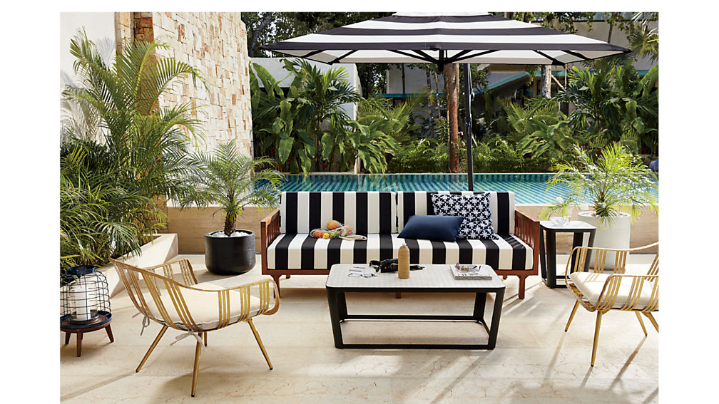 Tropaz Sofa ~ Want to make your patio feel like a beachy escape? This mahogany loveseat with classic black-and-white cabana-striped upholstery feels like it was taken straight from a Key West patio. Zip-off cushion covers make spills a cinch to tackle. Buy it: $1,000; CB2