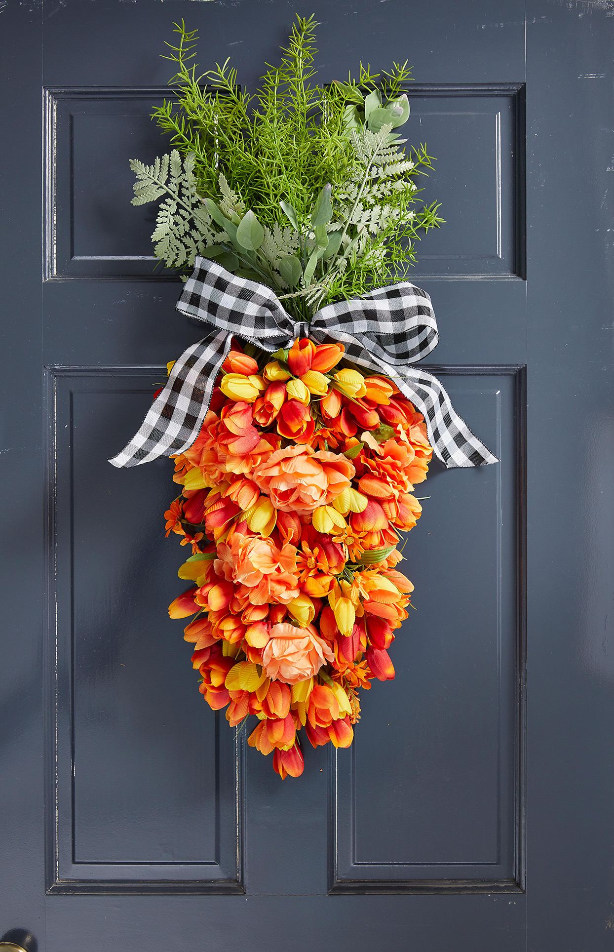 Entice the Easter bunny to visit your home with a beautiful carrot wreath made with artificial tulips like this one from MARTY BALDWIN. Trim several bunches of yellow and orange tulips and secure them to a paint stick with florists wire and hot glue. Add a few peachy-orange peonies for variety. Place greenery at the top of the greenery base and finish with a classic bow.