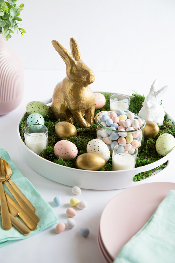 You’ll have this Easter DIY project, courtesy of ALICE AND LOIS, ready in a snap! Just fill a tray with moss from any craft store and votive candles. Finish the display with a bunny figure or even a chocolate bunny, then add candies and decorated eggs.
