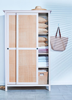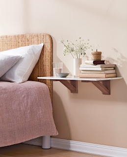 White marble floating nightstands and a rattan headboard look so crisp, clean and springy in this room by Trevor Tondro. To install a sleek floating nightstand, mount shelf brackets on your wall just above mattress height, and place a tile from any home improvement store or cover a piece of wood with peel and stick wallpaper in marble on top, for extra security, adhere it with epoxy or liquid nails.