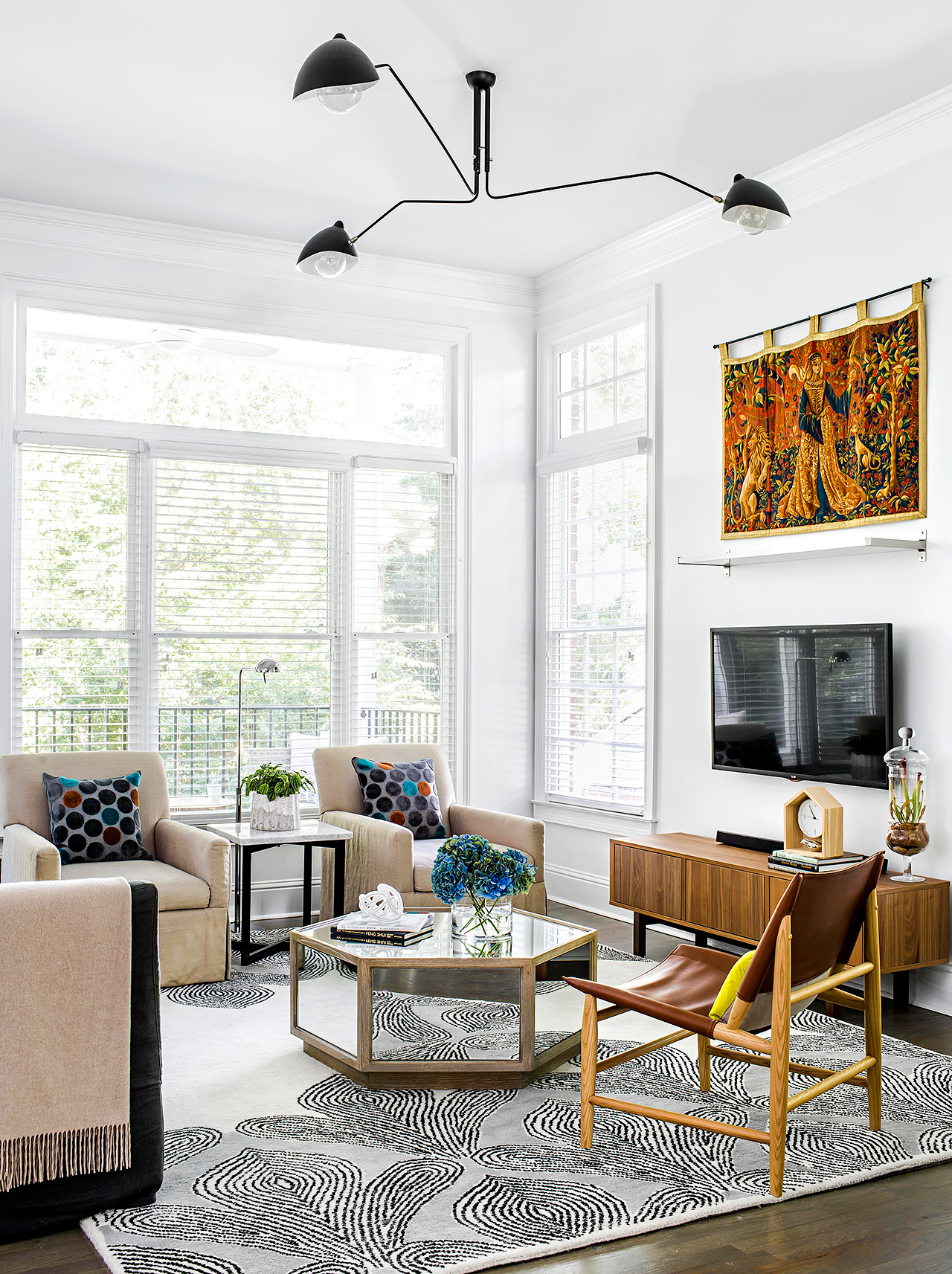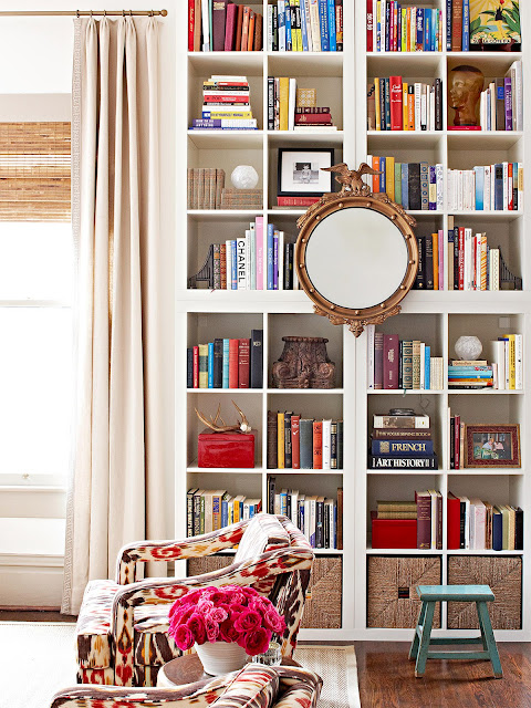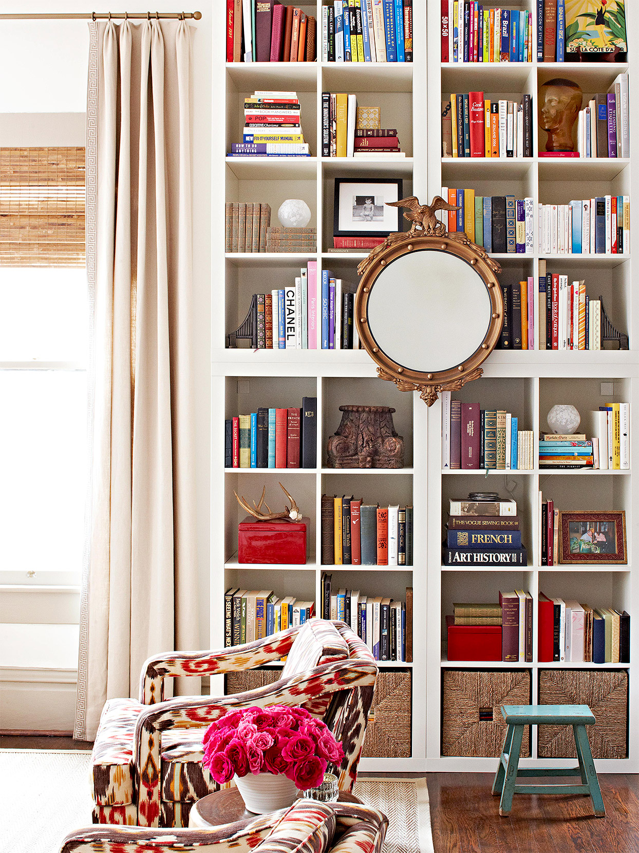 Create fake built-ins ~ If you like the look of library-like shelves but don’t want to splurge on a custom design, use bookcases to create the appearance of floor-to-ceiling built-ins. In this living room, four tall bookcases were stacked and secured to the wall with anchors. To reinforce the built-in look, consider adding trim along the top of the shelving units